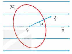 Câu 3. Đặt một vòng dây dẫn (C) phẳng, có diện tích S trong từ trường đều có vector cảm ứng từ $\vec{B}$. Gọi $\alpha$ là góc hợp bởi vector pháp tuyến $\vec{n}$ của mặt S và $\vec{B}$. Đại lượng $\Phi = BS\cos\alpha$ được gọi là