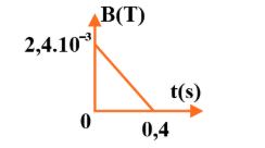 Câu 17. Một khung dây cứng phẳng diện tích 25 cm² gồm 10 vòng dây, đặt trong từ trường đều, mặt phẳng khung vuông góc với các đường cảm ứng từ. Cảm ứng từ biến thiên như hình vẽ. Suất điện động cảm ứng xuất hiện trong khung kể từ t = 0 đến t = 0,4 s có độ lớn là