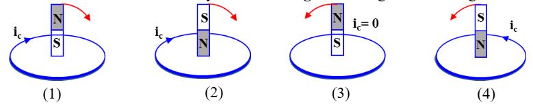 Câu 3. Một nam châm đặt trùng thẳng đứng trên bàn, trong một vòng dây kín. Ngay khi nam châm bị đỗ thì hình vẽ nào sau đây xác định đúng chiều dòng điện cảm ứng?