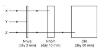 Câu 2. Hình dưới đây mô tả đường đi của ba loại tia phóng xạ X, Y và Z. Bản chất các tia X, Y và Z theo thứ tự là