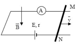 b. Ampe kế chỉ bao nhiêu khi MN di chuyển về phía phải với vận tốc v = 3 m/s sao cho 2 đầu MN luôn tiếp xúc với 2 thanh đỡ bằng kim loại? Tính độ lớn lực từ tác dụng lên thanh MN.