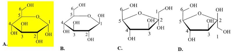 d. (vận dụng) Trong dung dịch, glucose tồn tại chủ yếu ở dạng vòng 6 cạnh và fructose tồn tại chủ yếu ở dạng mạch hở.