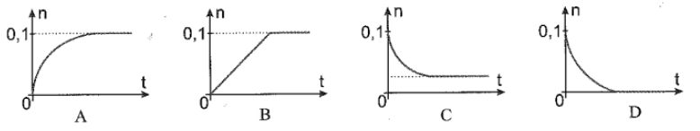Câu 16: (vận dụng) Thực hiện phản ứng ester hóa sau: cho 0,1 mol alcohol tác dụng với 0,1 mol carboxylic acid, có mặt $H_2SO_4$ đặc làm xúc tác. Đồ thị nào sau đây biểu diễn sự thay đổi số mol (n) alcohol theo thời gian (t)?