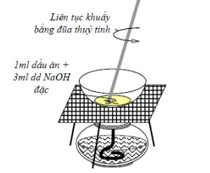 Tiến hành: − Cho khoảng 2 g chất béo và khoảng 4 mL dung dịch NaOH 40% vào bát sứ. Đun hỗn hợp trong khoảng 10 phút và liên tục khuấy bằng đũa thủy tinh. Nếu thể tích nước giảm cần bổ sung thêm nước. − Kết thúc phản ứng, đổ hỗn hợp vào cốc thủy tinh chứa khoảng 30 mL dung dịch NaCl bão hoà, khuấy nhẹ. Để nguội hỗn hợp, tách lấy khối xà phòng nổi lên ở trên.