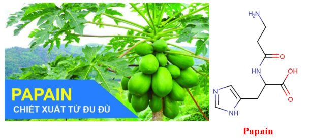 Câu 4: Papain là enzyme có tác dụng thủy phân protein, có nhiều trong quả đu đủ. Papain được tách từ nhựa đu đủ xanh, là một enzyme thực vật. Enzym papain rất tốt cho hệ tiêu hóa, giúp tiêu hóa các thức ăn giàu protein một cách dễ dàng hơn. Papain là enzyme có thể sản xuất thuốc điều trị các tác dụng phụ của xạ trị, hoặc nó có thể được sử dụng kết hợp với các liệu pháp khác để điều trị khối u,…