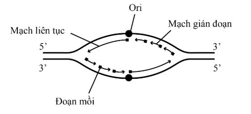a) DNA polymerase chỉ tổng hợp mạch mới theo chiều 5′ – 3′ nên mạch mã gốc có chiều 3′ – 5′ sẽ tổng hợp mạch mới liên tục và mạch bổ sung có chiều 5′ – 3′ sẽ tổng hợp mạch mới gián đoạn.