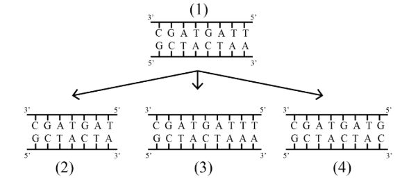 Câu 4: Hình ảnh dưới đây mô tả các dạng đột biến điểm. Đoạn gene (1) thuộc một gene chua biển đổi. Các đoạn (2), (3), (4) biểu thị một số dạng biến đổi của đoạn gene nói trên.