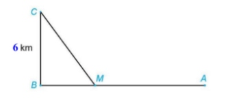 Một đường dây điện được nối từ một nhà máy điện ở $A$ đến một hòn đảo ở $C$ như Hình. Khoảng cách từ $C$ đến $B$ là $6km$. Bờ biển chạy thẳng từ $A$ đến $B$ với khoảng cách là $10km$. Tổng chi phí lắp đặt cho 1 km dây điện trên biển là 50 triệu đồng, còn trên đất liền là 30 triệu đồng.