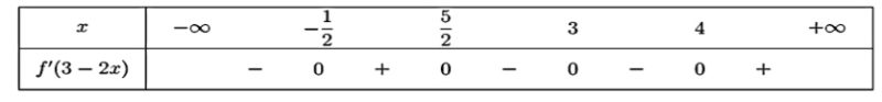 Cho hàm số $y = f(x)$ xác định và có đạo hàm trên $\mathbb{R}$. Biết rằng hàm số $y = f'(3 – 2x)$ có bảng xét dấu như sau: