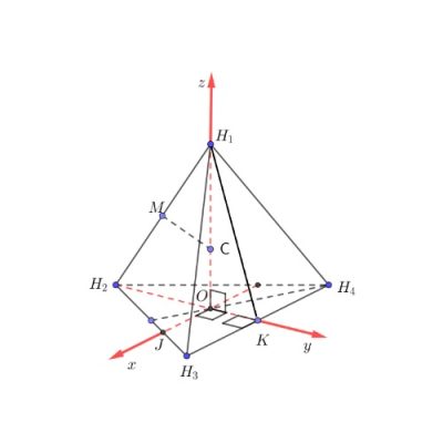 Trong không gian $Oxyz$, cho một phân tử $CH_4$ được biểu diễn bởi tứ diện đều $H_1H_2H_3H_4$ với O là tâm của đáy. Nguyên tử carbon được biểu diễn bởi điểm $C$, cách đều các đỉnh $H_1, H_2, H_3, H_4$ thuộc trục $Oz$, bốn nguyên tử hydrogen ở các vị trí $H_1, H_2, H_3, H_4$, trong đó $H_1(0; -2; 0)$ và $H_4H_1$ song song với trục $Ox$ (Hình 2). Gọi tọa độ nguyên tử carbon $C(x; y; z)$ hãy tính giá trị biểu thức $T = 2x – 3y + 4z$ (làm tròn kết quả đến hàng phần trăm).