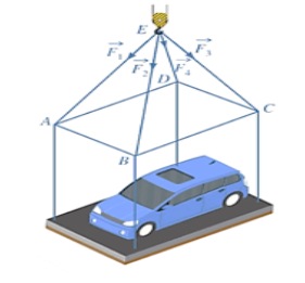Một chiếc ô tô được đặt trên mặt đáy dưới của một khung sắt có dạng hình hộp chữ nhật với đáy trên là hình chữ nhật $ABCD$, mặt phẳng $(ABCD)$ song song với mặt phẳng nằm ngang. Khung sắt độ được bước vào móc $E$ của chiếc xe cần cẩu sao cho tâm của đáy cáp $EA, EB, EC, ED$ có độ dài bằng nhau và cùng tạo với mặt phẳng $(ABCD)$ một góc bằng $60°$. Chiếc cần cẩu kéo khung sắt lên theo phương thẳng đứng.