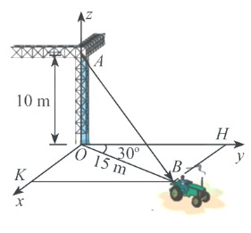 Một chiếc xe đang kéo căng sợi dây cáp $AB$ trong công trường xây dựng, trên độ dã thiết lập hệ tọa độ $Oxyz$ như hình vẽ dưới với độ dài đơn vị trên các trục tọa độ bằng $1m$. Biết $\overrightarrow{AB} = (x; y; z)$. Tính $x + y + z$ (làm tròn đến hàng phần chục).