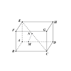 Cho hình hộp chữ nhật ABCD.EFGH có AB = AE = 2, AD = 3 và đặt $\vec{a} = \overrightarrow{AB}$, $\vec{b} = \overrightarrow{AD}$, $\vec{c} = \overrightarrow{AE}$. Lấy điểm M thỏa mãn $\overrightarrow{AM} = \frac{1}{5}\overrightarrow{AD}$ và điểm N thỏa mãn $\overrightarrow{EN} = \frac{2}{5}\overrightarrow{EC}$.