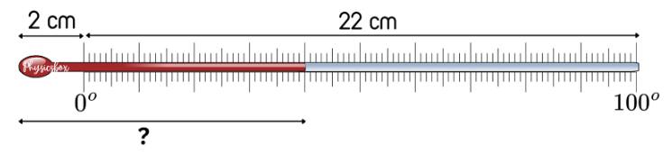 Câu 1. Một nhiệt kế thủy ngân có chiều dài của phần thủy ngân trong nhiệt kế là 2 cm ở 0°C và khoảng cách từ 0°C đến 100°C là 22 cm (như hình vẽ). Dùng nhiệt kế để đo nhiệt độ một thau nước, lúc chiều dài phần thủy ngân là bao nhiêu cm?