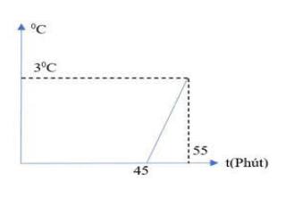 Câu 3. Một chậu đựng hỗn hợp nước và nước đá có khối lượng 14kg. Chậu để trong phòng và người ta theo dõi nhiệt độ của hỗn hợp. Đồ thị biểu thị sự phụ thuộc thời gian theo nhiệt độ cho ở hình vẽ. Nhiệt dung riêng của nước là $c = 4200$ J/kg.K, nhiệt nóng chảy của nước đá $\lambda = 3,4.10^5$ J/kg. Bỏ qua sự mất mát nhiệt. Khối lượng nước đá ban đầu bằng bao nhiêu kg (làm tròn đến 1 chữ số sau dấu phẩy)