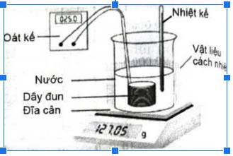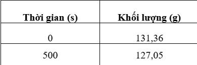 Câu 1. Hình bên là bộ trí thí nghiệm xác định nhiệt hóa hơi riêng của nước. Dùng dây đun công suất 25W làm nóng nước trong một cốc được đặt trên cân. Nhiệt kế cho biết nhiệt độ của nước. Dây đun hoạt động bình thường. Khi nước sôi, số chỉ khối lượng trên cân giảm dần theo thời gian và được ghi lại 2 giá trị trong bảng sau: