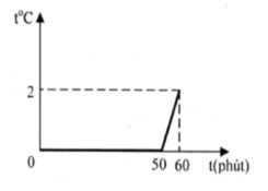 Câu 2. Một chậu đựng hỗn hợp gồm 7,5 kg nước ở thể lỏng và 2,5 kg nước đá. Chậu để trong phòng và người ta theo dõi nhiệt độ của hỗn hợp. Đồ thị biểu thị sự phụ thuộc nhiệt độ theo thời gian cho ở hình vẽ. Nhiệt dung riêng của nước là $c = 4200$ J/kg.K và nhiệt nóng chảy của nước là $\lambda = 3,4.10^5$ J/kg. Bỏ qua nhiệt dung của chậu.