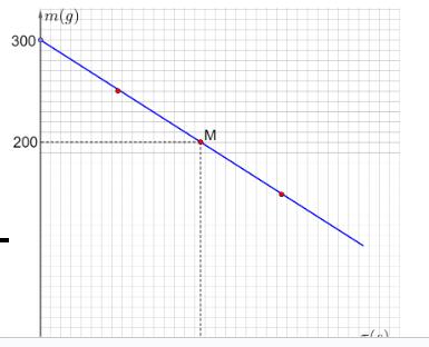 Câu 6. Một học sinh làm thí nghiệm đo nhiệt hóa hơi riêng của nước. Ấm đun nước học sinh sử dụng có công suất $1500W$. Từ kết quả thí nghiệm, học sinh vẽ được đồ thị quan hệ giữa khối lượng nước trong ấm và thời gian của quá trình hóa hơi của nước như hình bên. Nhiệt hóa hơi riêng của nước mà học sinh này đo được gần đúng bằng bao nhiêu $MJ/kg$