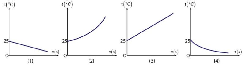 Câu 12: Đồ thị nào sau đây biểu diễn sự thay đổi nhiệt độ theo thời gian của nước $25°C$ trong bình nhiệt lượng kế khi được nóng nóng.