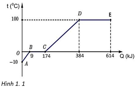 Câu 5: Hình 1.1 là đồ thị biểu diễn sự phụ thuộc của nhiệt độ của khối nước đá nặng 200 g vào nhiệt lượng mà nó nhận được từ lúc đun đến lúc sôi. Nhiệt nóng chảy của khối nước đá trong quá trình trên là bao nhiêu kJ?