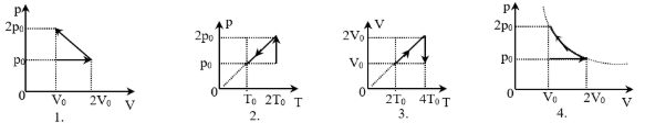 Câu 3: Một khối khí lí tưởng, có các thông số trạng thái là $p_0, V_0, T_0$. Biến đổi đẳng áp đến $2V_0$, sau đó nén đẳng nhiệt về thể tích ban đầu. Đồ thị nào sau đây diễn tả đúng quá trình trên?