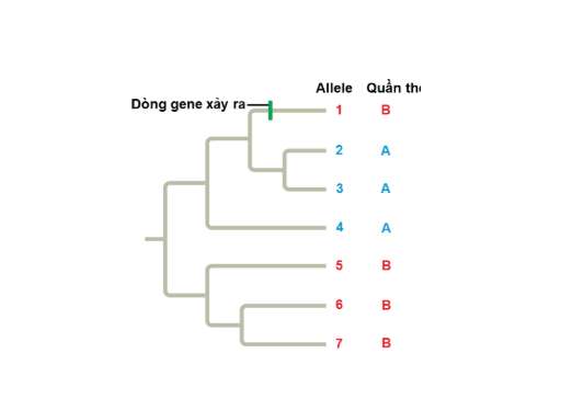 a. Allele 1 tìm thấy ở quần thể B có họ hàng gần hơn với allele 2, 3, 4 tìm thấy ở quần thể A.
