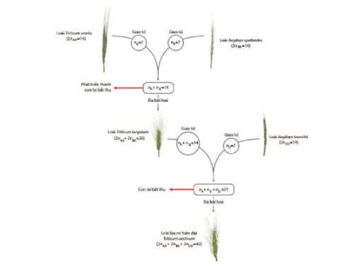 Câu 1. Quá trình hình thành loài lúa mì (T. aestivum) được các nhà khoa học mô tả như hình dưới đây. Bộ NST của loài lúa mì (T. aestivum) là tổ hợp bộ NST lưỡng bội của bao nhiêu loài lúa mì khác nhau?