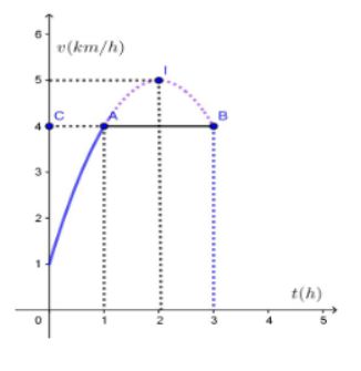 Câu 3: Một vật chuyển động trong 3 giờ với vận tốc v(km/h) phụ thuộc vào thời gian t(h). Đồ thị vận tốc của vật được cho như hình bên. Trong khoảng thời gian 1 giờ kể từ khi bắt đầu chuyển động, đồ thị vận tốc là một phần của đường parabol có đỉnh $I(2; 5)$ và trục đối xứng song song với trục tung. Trong khoảng thời gian còn lại, đồ thị vận tốc là một đoạn thẳng song song với trục hoành. Tính quãng đường mà vật đã di chuyển được trong 3 giờ đó (đơn vị: km) (làm tròn kết quả đến hàng phần chục).