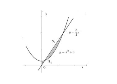 Câu 1: Cho đường thẳng $y = \frac{3}{2}x$ và parabol $y = x^2 + a$ (a là tham số thực dương). Gọi $S_1, S_2$ lần lượt là diện tích hai hình phẳng được gạch chéo trong hình vẽ bên. Khi $S_1 = S_2$ thì a bằng bao nhiêu? (làm tròn đến hàng phần trăm)