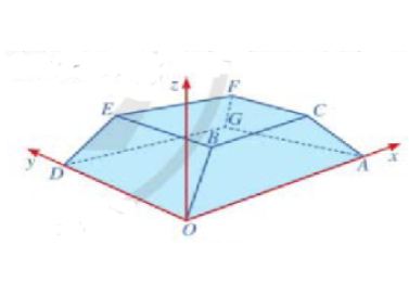 Câu 3: Hình ảnh minh họa một tòa nhà trong không gian với hệ trục tọa độ $Oxyz$ (đơn vị trên mỗi trục là mét). Biết $A(50; 0; 0), D(0; 20; 0), B(4k; 3k; 2k)$ với $k > 0$ và mặt phẳng $(CBEF)$ có phương trình là $z = 3$. Hãy tình khoảng cách từ điểm A đến mặt phẳng $(OBD)$ (làm tròn đến hàng phần chục)