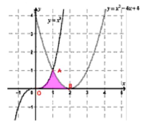Câu 19. Tính diện tích phần hình phẳng được tô đậm trong hình vẽ dưới đây được giới hạn bởi các đồ thị hàm số $y = x^3$, $y = x^2 – 4x + 4$ và trục Ox.