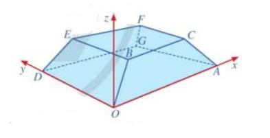 Câu 6 (MH3.1) Một sân vận động được xây dựng theo mô hình là hình chóp cụt $OAGD.BCFE$ có hai đáy song song với nhau. Mặt sân $OAGD$ là hình chữ nhật và được gắn hệ trục $Oxyz$ như hình vẽ dưới (đơn vị trên mỗi trục tọa độ là mét). Mặt sân $OAGD$ có chiều dài $OA = 100m$, chiều rộng $OD = 60m$ và tọa độ điểm $B(10;10;8)$.