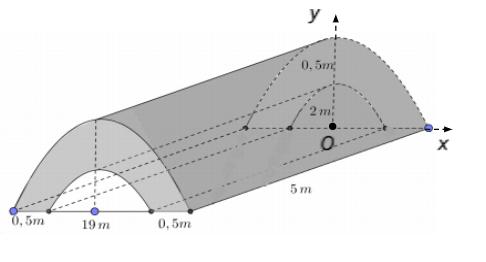 Câu 3. Trong chương trình nông thôn mới, tại một xã Y có xây một cây cầu bằng bê tông như hình vẽ (đường cong trong hình vẽ là các đường Parabol). Thể tích khối bê tông để đổ đủ cây cầu bằng $x$ (tính theo đơn vị $m^3$). Tìm $x$.