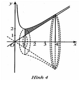 Câu 4. Một chiếc bát thủy tinh có bề dày của phần xung quanh là một khối tròn xoay, khi xoay hình phẳng $D$ quanh một đường thẳng $a$ bất kì nào đó mà khi gắn hệ trục tọa độ $Oxy$ (đơn vị trên trục là decimet) vào hình phẳng $D$ tại một vị trí thích hợp thì đường thẳng $a$ sẽ trung với trục $Ox$. Khi đó hình phẳng $D$ được giới hạn bởi các đồ thị hàm số $y = x + \frac{1}{x}$, $y = x$ và hai đường thẳng $x = 1$, $x = 4$ (Hình 4). Thể tích của bề dày chiếc bát thủy tinh đó bằng bao nhiêu decimet khối? (làm tròn kết quả đến hàng phần mười).
