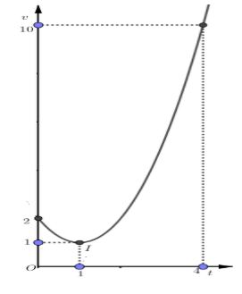 Câu 3 (MH2.1): Một vật chuyển động trong $4$ giờ với vận tốc $v$ (km/h) phụ thuộc thời gian $t$ (h) có đồ thị là một phần của đường parabol có đỉnh $I(1;1)$ và trục đối xứng song song với trục tung như hình bên. Gọi $S$ là quãng đường (tính bằng km) mà vật đi chuyển được trong $4$ giờ kể từ lúc xuất phát, giá trị gần đúng của $S$ (làm tròn đến hàng phần chục) là: