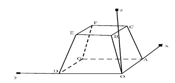 Câu 6. (VD MH2.1) Một sân vận động được xây dựng theo mô hình là hình chóp cụt $OAGD.BCFE$ có hai đáy song song với nhau. Mặt sân $OAGD$ là hình chữ nhật và được gắn hệ trục $Oxyz$ như hình vẽ dưới (đơn vị trên mỗi trục tọa độ là mét). Mặt sân $OAGD$ có chiều dài $OA = 100m$, chiều rộng $OD = 60m$ và tọa độ điểm $B(10;10;8)$. Tính khoảng cách từ điểm $G$ đến mặt phẳng $(OBED)$ (Làm tròn kết quả đến chữ số thập phân thứ nhất).