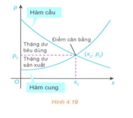 Điểm cắt nhau $(x_0; p_0)$ của đồ thị hàm cầu $p = D(x)$ và đồ thị hàm cung $p = S(x)$ được gọi là điểm cân bằng. Các nhà kinh tế gọi diện tích của hình giới hạn bởi đồ thị hàm cầu, đường ngang $p = p_0$ và đường thẳng đứng $x = 0$ là thặng dư tiêu dùng. Tương tự, diện tích của hình giới hạn bởi đồ thị của hàm cung, đường nằm ngang $p = p_0$ và đường thẳng đứng $x = 0$ được gọi là thặng dư sản xuất, như trong Hình 4.19.