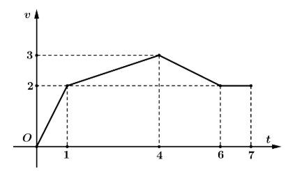 Câu 2: Một chiếc xe chuyển động với đồ thị vận tốc được biểu diễn theo đường gấp khúc được minh họa trên hệ trục $Otv$ như hình vẽ (mỗi đơn vị trên $Ot$ ứng với 1 phút và mỗi đơn vị trên $Ov$ ứng với $0,4 km/$ phút).