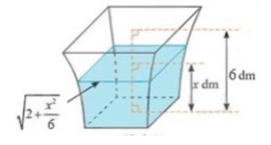 Câu 4: Một bình chứa nước có dạng như hình vẽ. Biết rằng khi nước trong bình có chiều cao $x (dm)$ ($0 \leq x \leq 6$) thì mặt nước là hình vuông có cạnh $\sqrt{2 + \frac{x^2}{6}} (dm)$. Tính dung tích của bình.