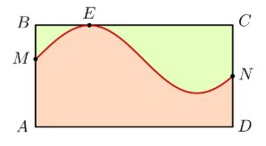 Câu 2: Từ một tấm tôn hình chữ nhật $ABCD$ với $AB = 30$ cm, $AD = 3$ cm. Người ta cắt tấm tôn theo đường hình sin như hình vẽ bên để được hai miếng tôn. Biết $CN = 15$ cm, $BE = 5\pi$ cm. Tính thể tích $V$ (đơn vị: lít) của khối tròn xoay được tạo thành khi xoay miếng tôn lớn quanh trục $AD$. (kết quả làm tròn đến hàng phần chục)