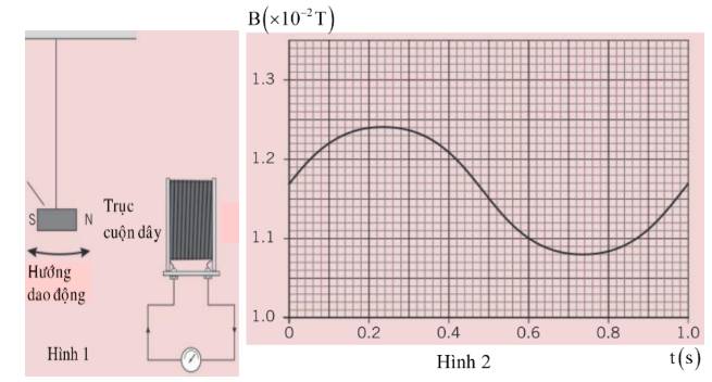 Câu 1. Trong Hình 1, một thanh nam châm N-S nhỏ, có cảm ứng từ đủ mạnh được sử dụng như vật nặng của một con lắc đơn. Cho nam châm dao động với biên độ nhỏ trên quỹ đạo thẳng trung với trục của một cuộn dây có 240 vòng, với điện tích tiết điện thẳng của mỗi vòng dây là 2,5 cm². Hai đầu cuộn dây được nối với một điện kế để kiểm tra cường độ dòng điện xuất hiện trong cuộn dây. Hình 2 là đồ thị biểu diễn sự phụ thuộc của cảm ứng từ theo thời gian. Hệ thống được bố trí sao cho tại bất kì thời điểm t đường sức từ của từ trường do thanh nam châm gửi qua cuộn dây có thể coi là đồng đều.