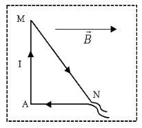 Câu 3. Một dây dẫn được uốn thành một khung dây có dạng hình tam giác vuông AMN có AM = 8 cm, AN = 6 cm. Đặt khung dây vào trong từ trường đều có vector cảm ứng từ $\vec{B}$ song song với cạnh AN, độ lớn cảm ứng từ B = 3 mT. Coi khung dây nằm có định trong mặt phẳng vuông góc với vector cảm ứng từ. Cho dòng điện cường độ I = 5 A chạy trong khung dây thì tổng độ lớn lực từ tác dụng lên hai cạnh MN và AM bằng bao nhiêu mili newton (mN)?