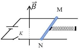 Câu 4. Một thanh kim loại MN có chiều dài 20 cm được nối cách điện với một lò xo nhẹ có độ cứng k, đầu còn lại của lò xo gắn cố định. Hệ đặt trong từ trường đều, độ lớn cảm ứng từ B = 1 T, vector cảm ứng từ $\vec{B}$ vuông góc với MN như hình. Ban đầu lò xo không biến dạng, có chiều dài tự nhiên là 10 cm. Đóng khóa để dòng điện cường độ 5A chạy qua thì thanh MN trượt không ma sát trên hai thanh ray và dừng lại khi lò xo có chiều dài 15 cm. Bỏ qua suất điện động cảm ứng trong thanh. Độ cứng k của lò xo bằng bao nhiêu newton/mét (N/m)?