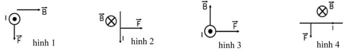 Câu 4. Xét đoạn dây dẫn thẳng, dài mang dòng điện đặt trong từ trường đều theo phương vuông góc với đường sức từ. Hình vẽ nào dưới đây biểu diễn đúng phương chiều của lực từ tác dụng lên dây dẫn?