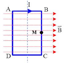 Câu 1. Một khung dây cứng hình chữ nhật ABCD cạnh AB = 10 cm; BC = 20 cm, có thể quay quanh trục Δ. Khung dây đặt trong từ trường đều có vector cảm ứng từ $\vec{B}$ song song với mặt phẳng khung như hình vẽ; độ lớn cảm ứng từ B = 0,04 T. Cho dòng điện cường độ I = 4 A chạy qua khung