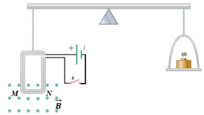Câu 2. Hình bên minh họa việc thực hành đo độ lớn cảm ứng từ. Một cuộn dây hình chữ nhật có N = 50 vòng, cạnh MN = l = 5cm. Cuộn dây được gắn vào một cánh tay của cân và được treo sao cho cạnh MN nằm trong vùng từ trường đều có cảm ứng từ vuông góc với mặt phẳng cuộn dây. Ban đầu khóa K mở, điều chỉnh đòn cần cân bằng (nam châm). Đóng khóa K để dòng điện chạy qua khung dây thì ta phải thêm vào bên phải quả cân khối lượng m để hệ cân bằng. Xem lực từ tác dụng lên khung dây chủ yếu do lực từ tác dụng lên đoạn MN và gia tốc rơi tự do g = 9,8 m/s².