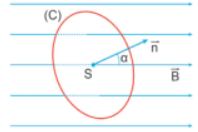 Câu 5. Xét một vòng dây dẫn kín có điện tích S và vector pháp tuyến $\vec{n}$, được đặt trong một từ trường đều B (hình bên). Gọi $\alpha$ là góc hợp bởi $\vec{B}$ và $\vec{n}$. Từ thông $\Phi$ qua điện tích S được tính theo công thức