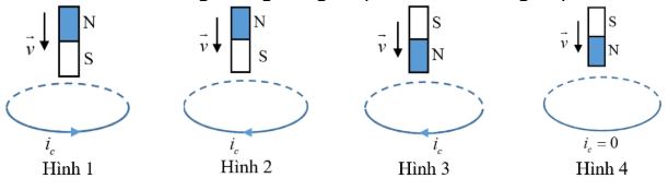 Câu 6. Hình nào sau đây biểu diễn đúng chiều của dòng điện cảm ứng $i_c$ trong vòng dây dẫn khi cho nam châm rơi tự do theo đường thẳng đứng đi qua tâm của vòng dây đặt trên bàn?