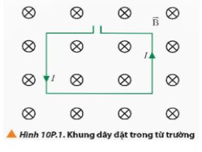 Câu 1. Đặt một khung dây dẫn hình chữ nhật mang dòng điện có cường độ I trong từ trường đều có vector cảm ứng từ vuông góc với mặt phẳng khung dây như Hình 10P.1. Xác định lực từ tác dụng lên các cạnh của khung dây và nhận xét.