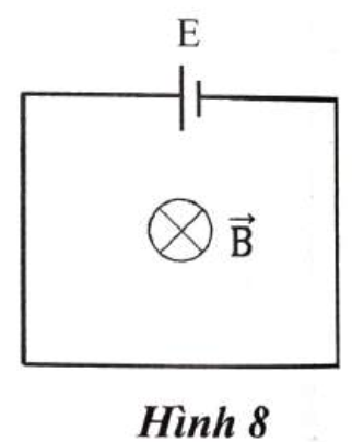 Câu 2. Một dây dẫn có chiều dài 1 = 2 m, điện trở R = 4Ω được uốn thành một khung dây hình vuông. Khung dây được đặt cố định trong một từ trường đều sao cho các đường sức từ vuông góc với mặt phẳng khung. Một nguồn điện có suất điện động E = 2,7 V và điện trở trong r = 0 được mắc vào một cạnh của khung dây (Hình 8). Cho cảm ứng từ tăng đều từ B₀ = 0,02 T đến B = 0,08 T trong thời gian 0,05 s. Biết rằng khung dây không bị biến dạng. Cường độ của dòng điện chạy trong mạch bằng bao nhiêu ampe? Kết quả lấy đến hai chữ số sau dấu phẩy thập phân.